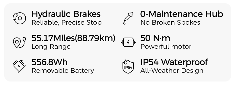 | Drivetrain | Rear Derailleur: SHIMANO TY300DShifters: SHIMANO TX50Chain: KMC Z7Crank: Aluminum alloy 52TRear Cogs: SHIMANO TZ500 7S (14-28T)Sensor: 2025 – Mivice S200 torque, Old – 12-magnet cadence |